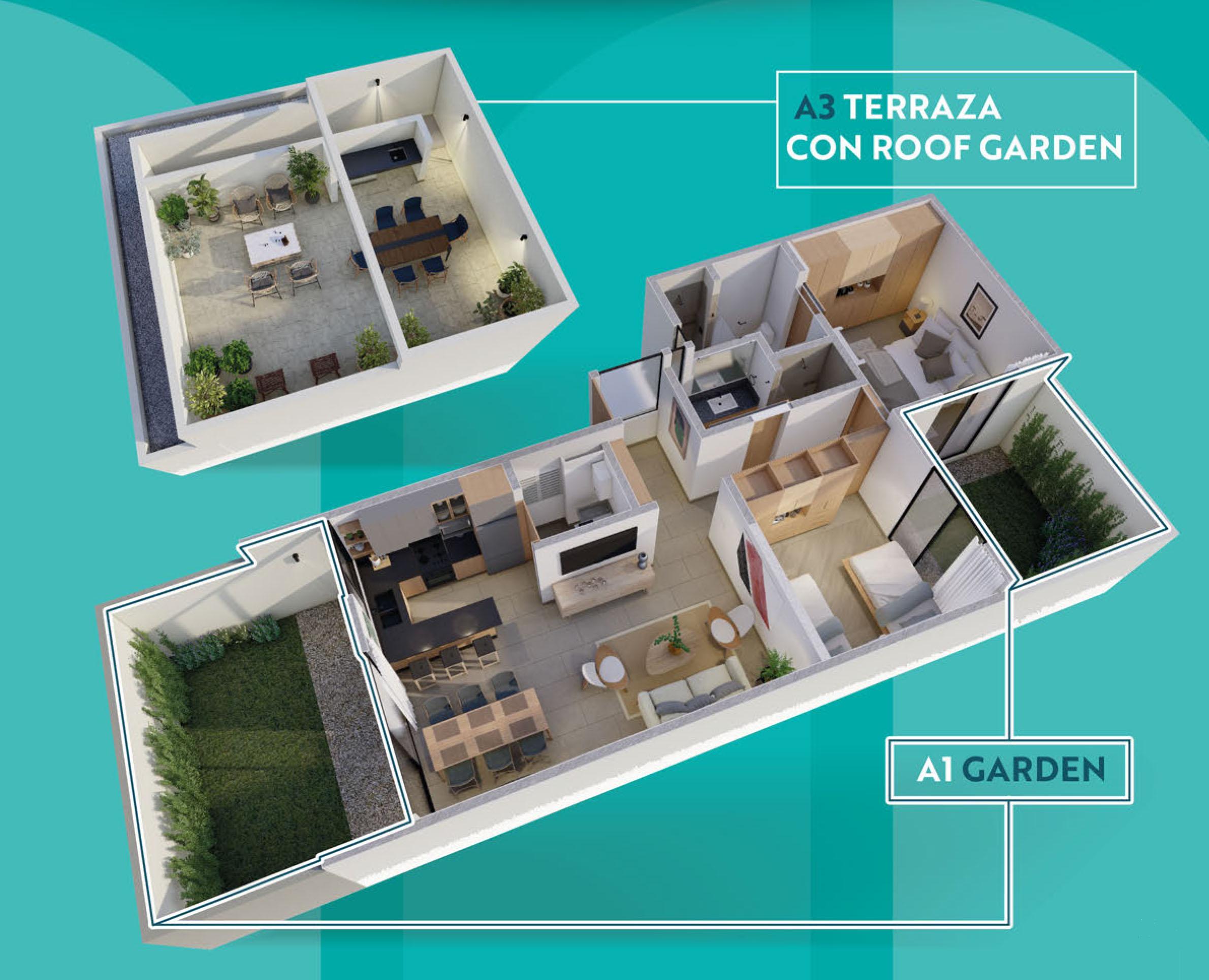 El desarrollo ofrece opciones de personalización:Departamento con terraza tipo roof garden.Departamento con balcón en lugar de jardín.