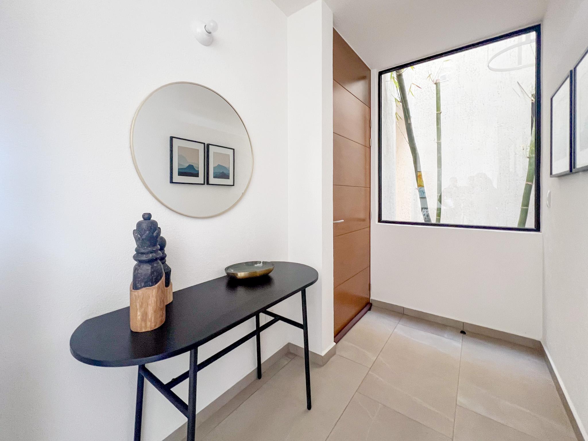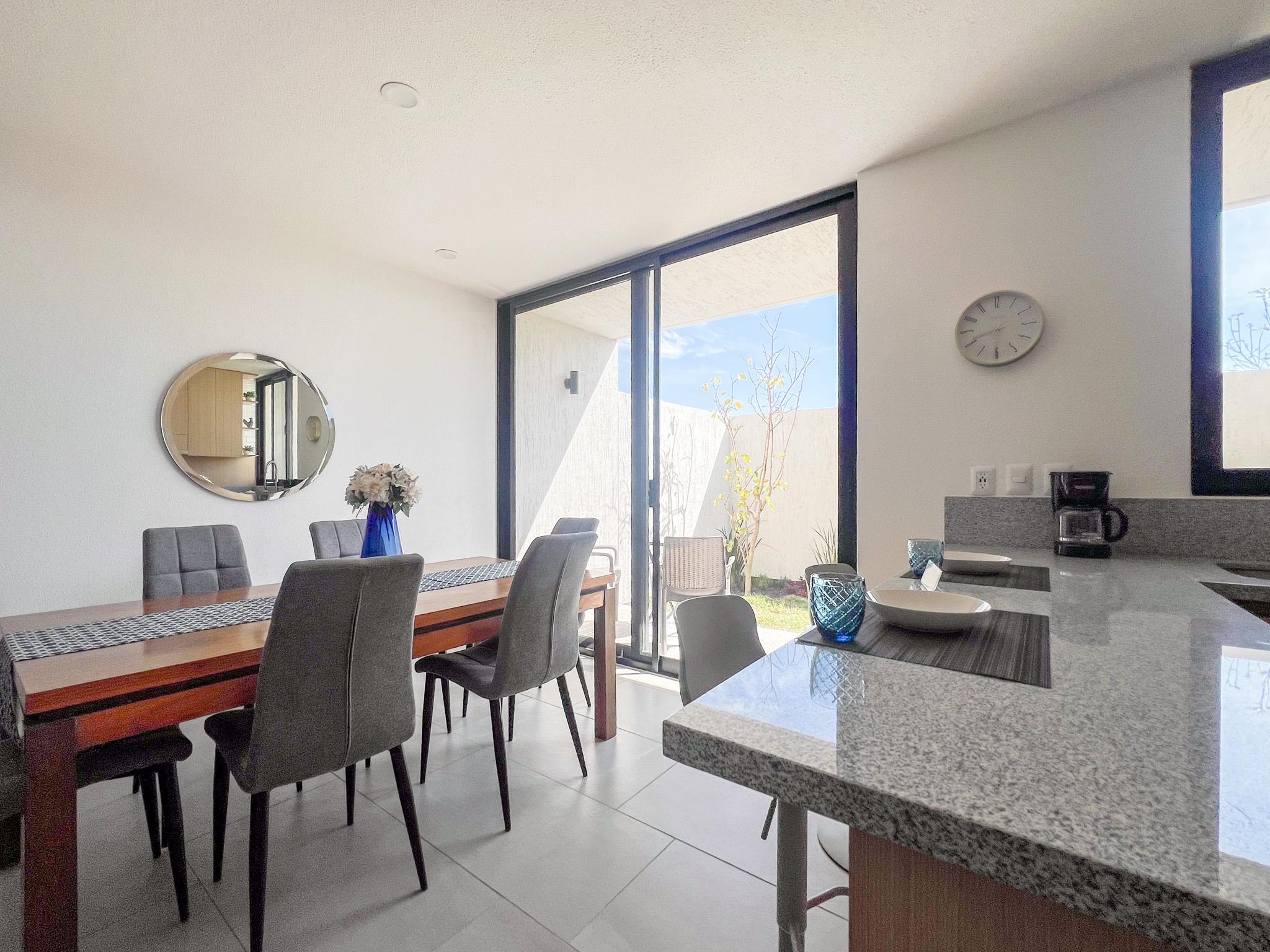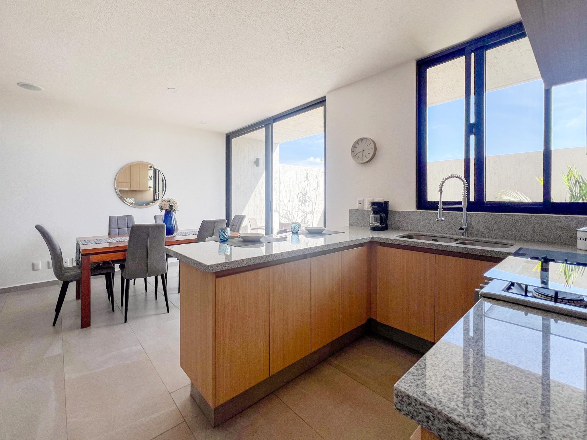 Cuenta con dos recámaras, la principal con baño completo, dos baños y medio en total, sala y comedor con diseño abierto, cocina equipada con barra desayunador y sonido ambiental en sala y comedor.