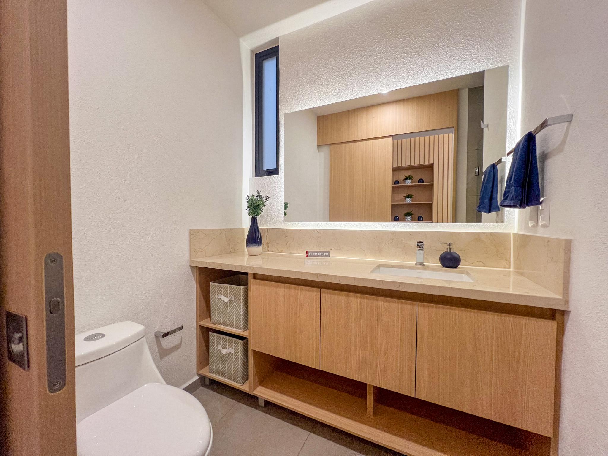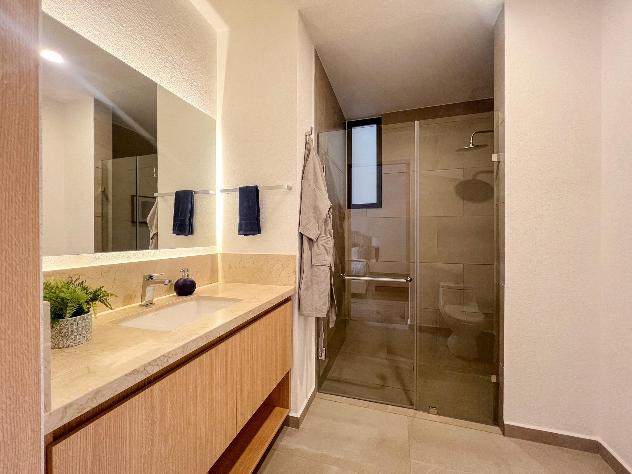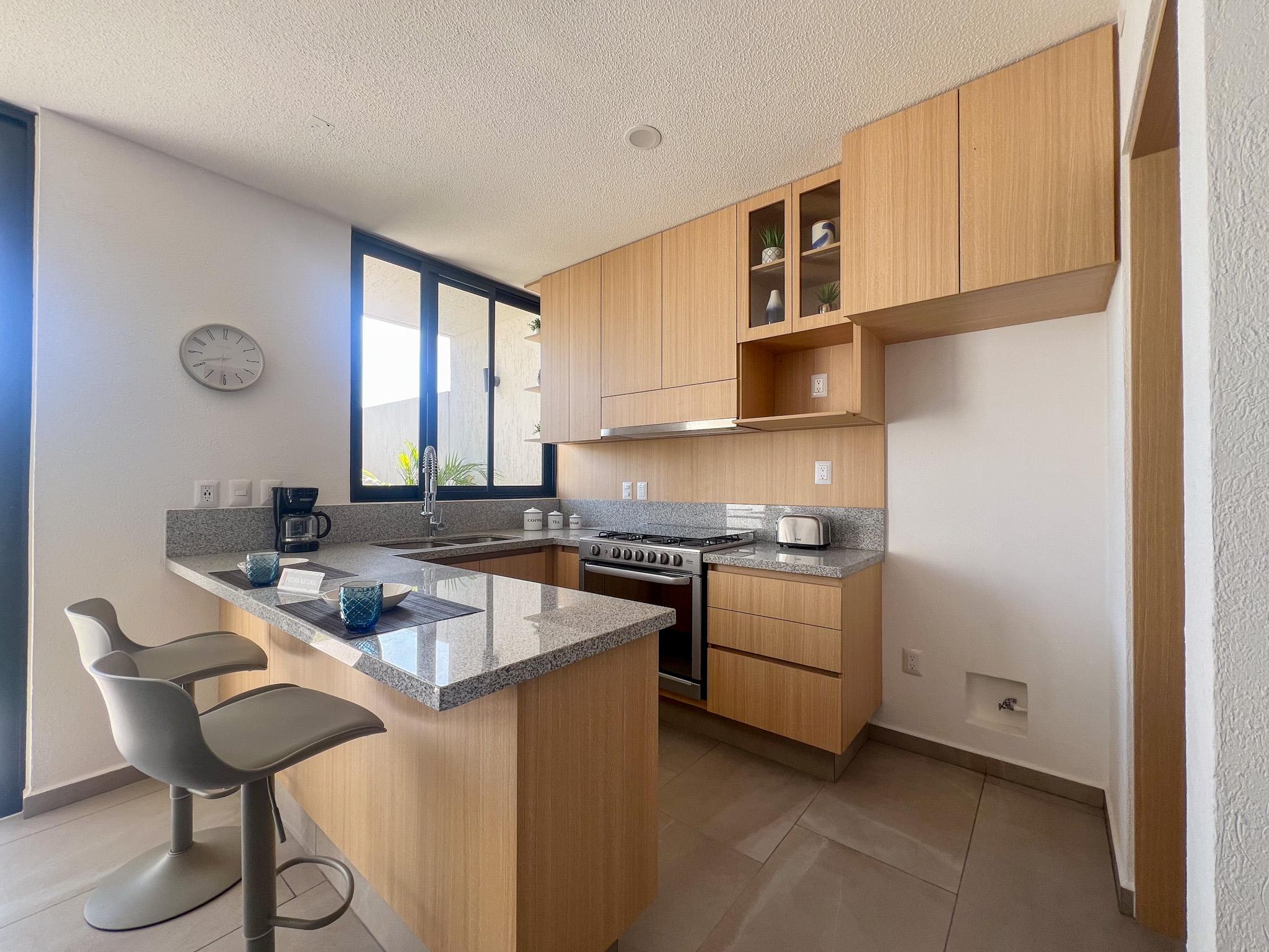 Cuenta con dos recámaras, la principal con baño completo, dos baños y medio en total, sala y comedor con diseño abierto, cocina equipada con barra desayunador y sonido ambiental en sala y comedor.