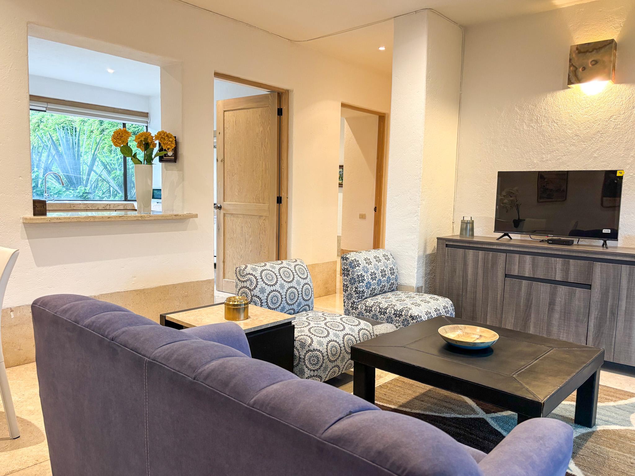 No dejes ir este espacio amueblado de tres recámaras y dos y medio baños en planta baja sin desniveles y espectaculares vistas a jardines y patios.